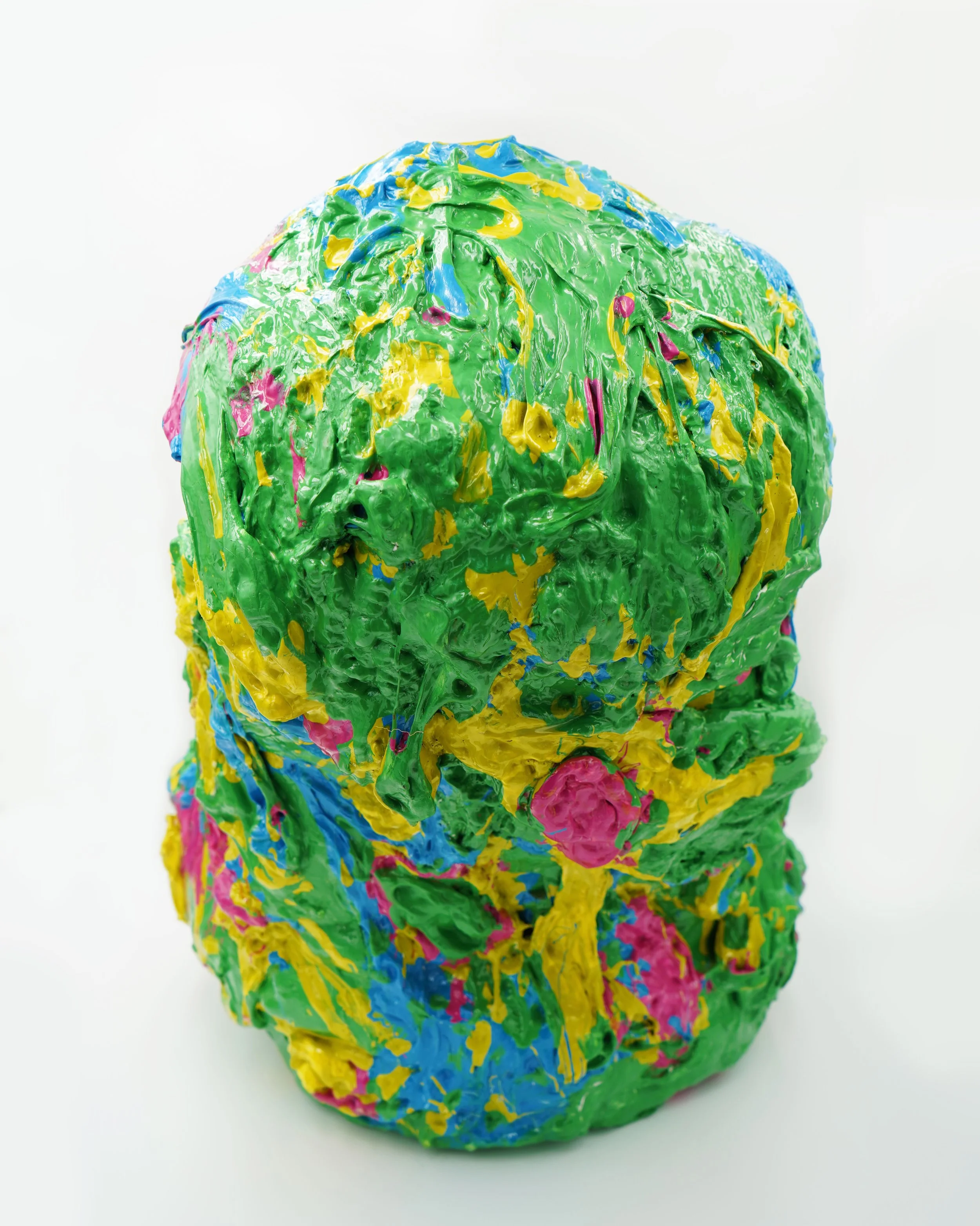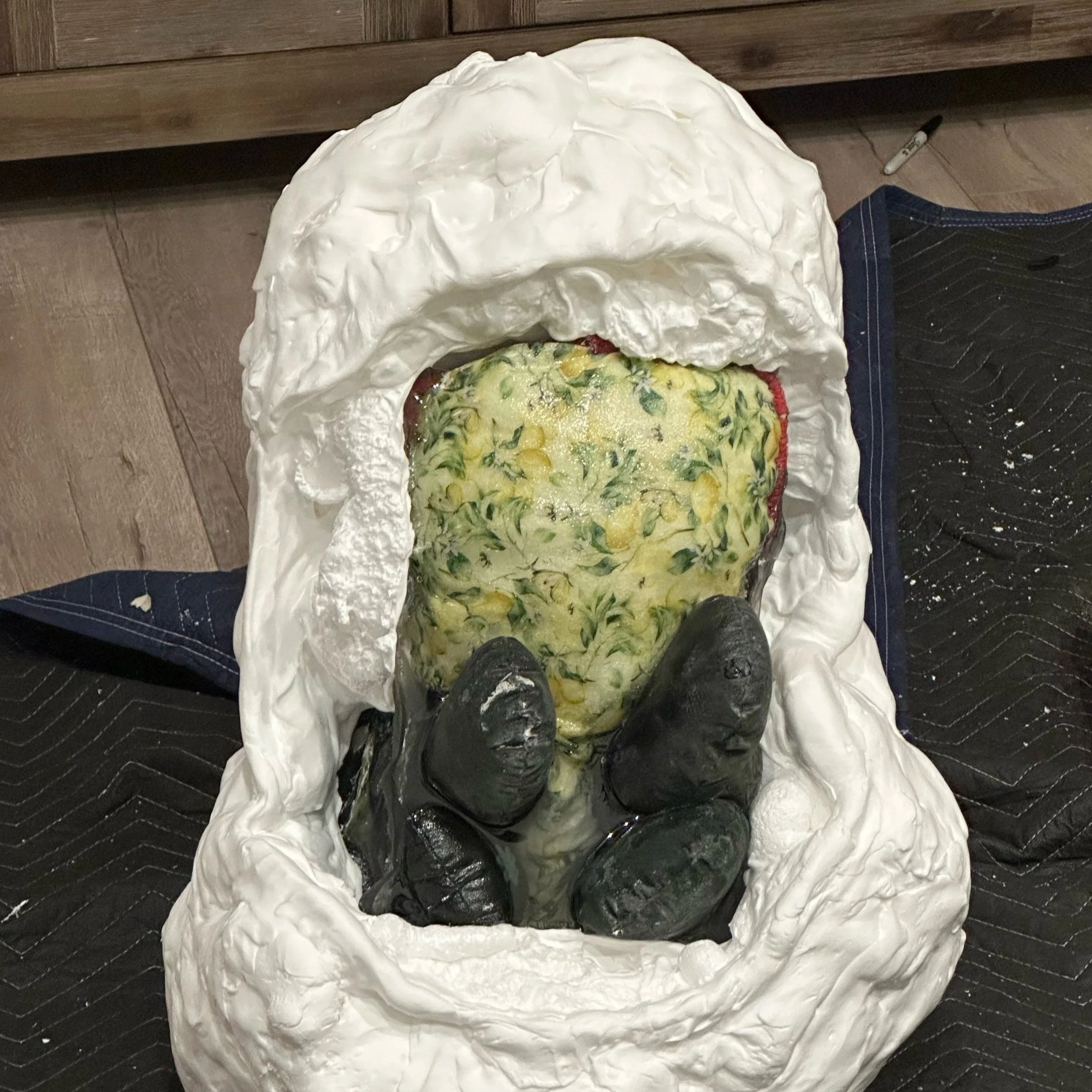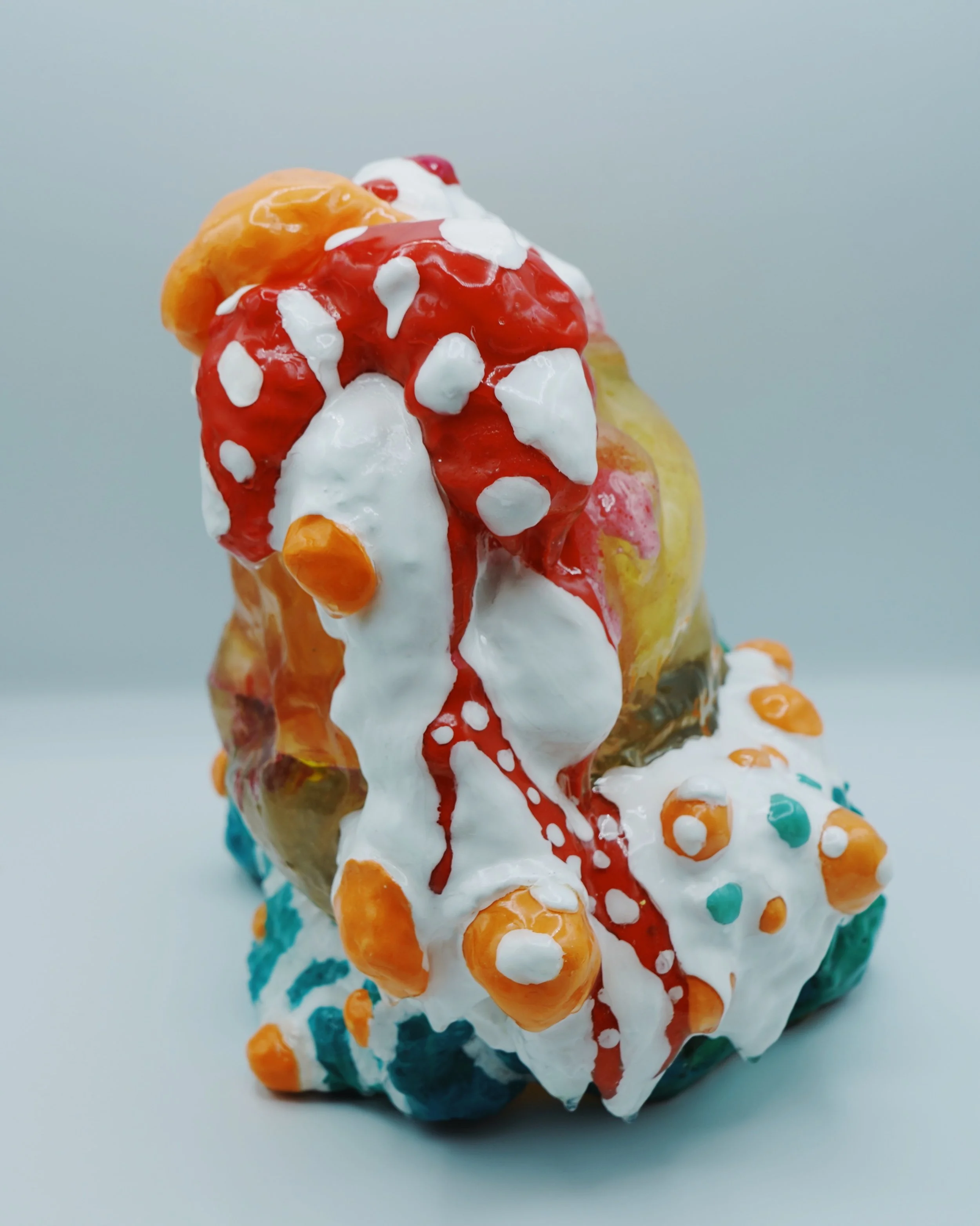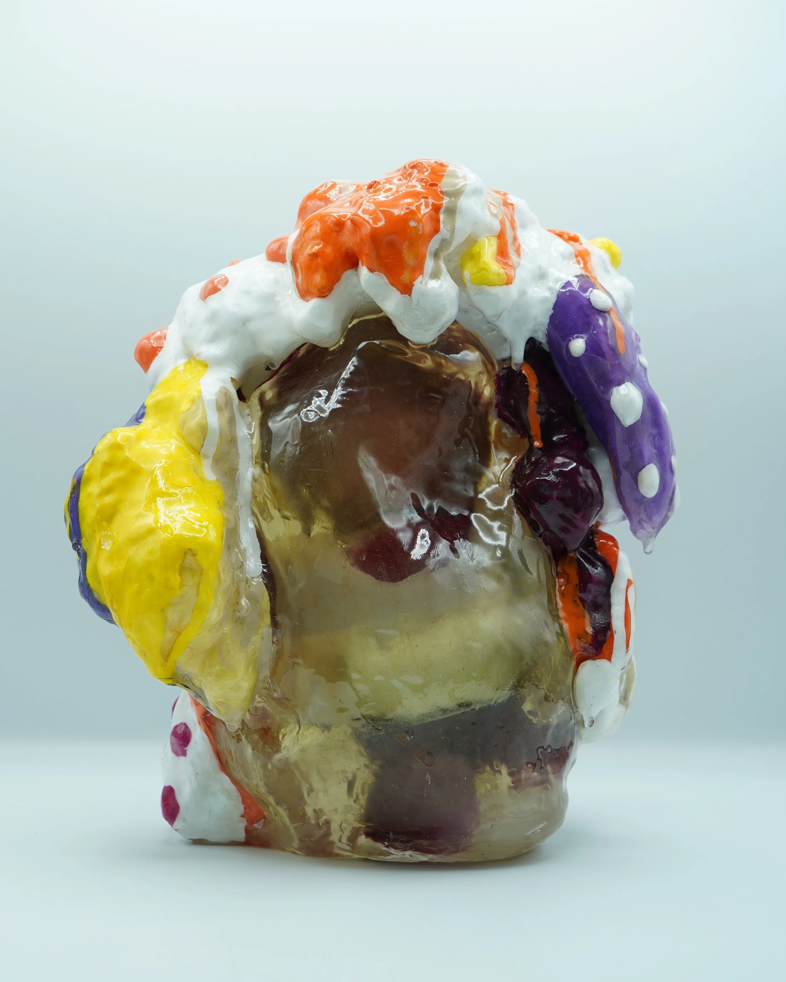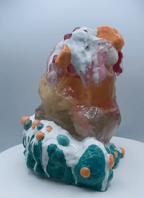 This collection reflects the memories that we hold so deeply inside of us. Each resin sculpture contains a plushie at its center. The sculptures are masked and textured with foam, clay, spray paint and acrylic, mimicking the dream-like state memories can reside in. At first glance, the plushie looks familiar, almost identical to the plushie I played with as a child. However, as you come closer, it is noticeable that the plushie is poorly stitched with fabric that does not match the original.