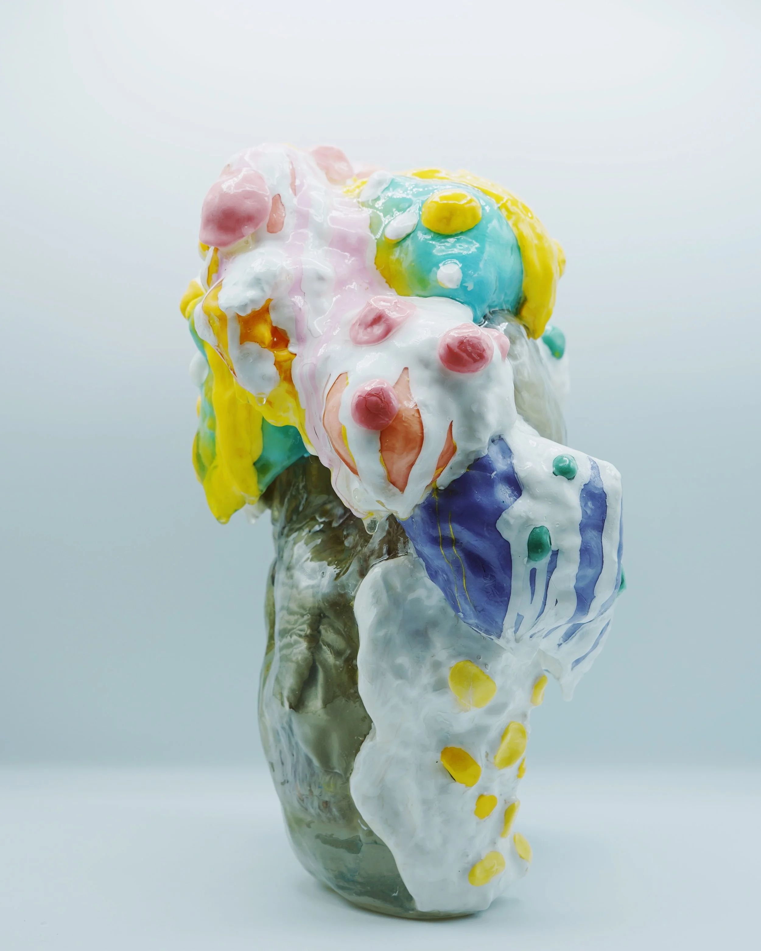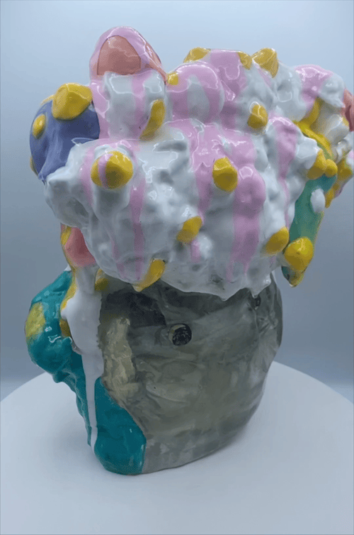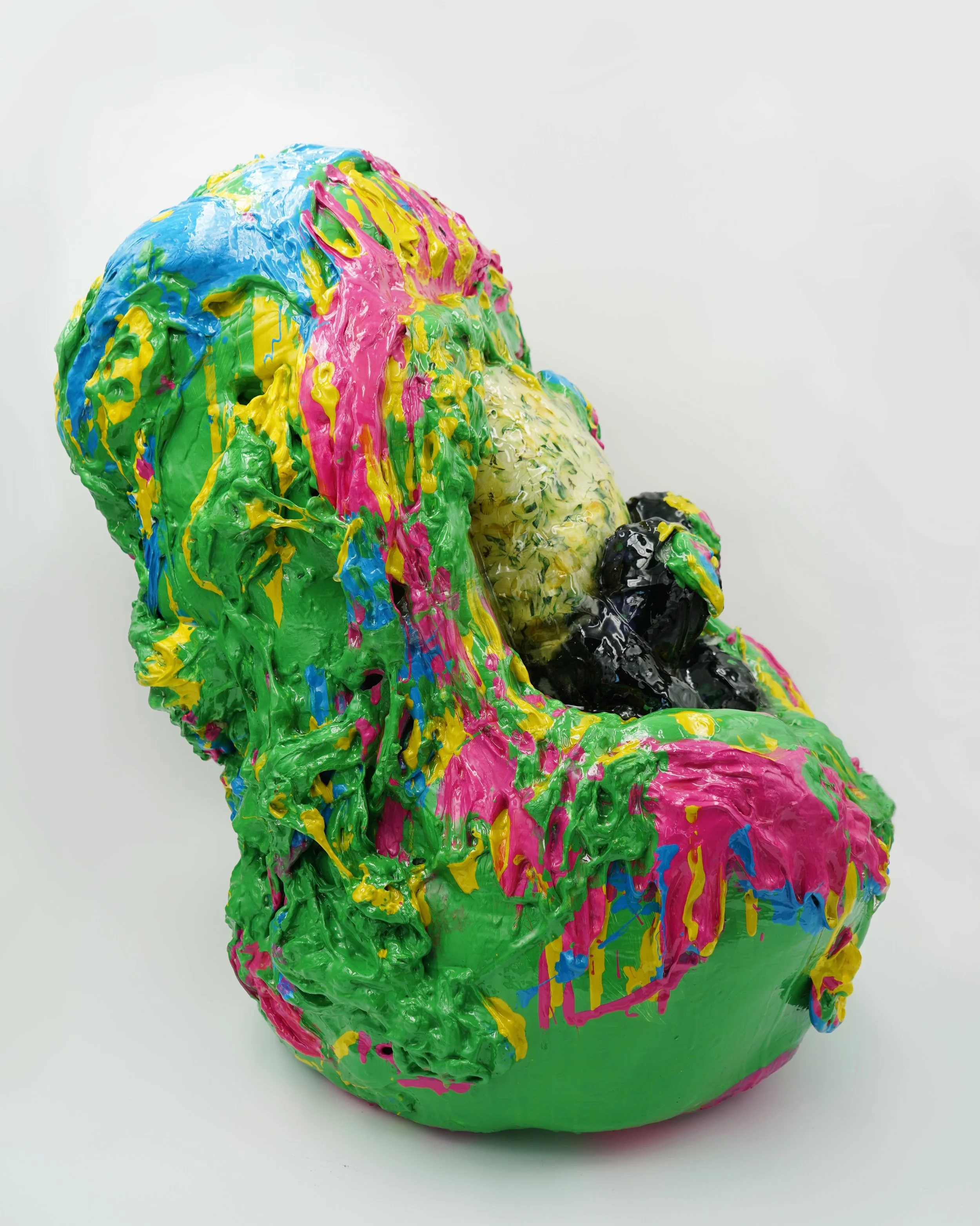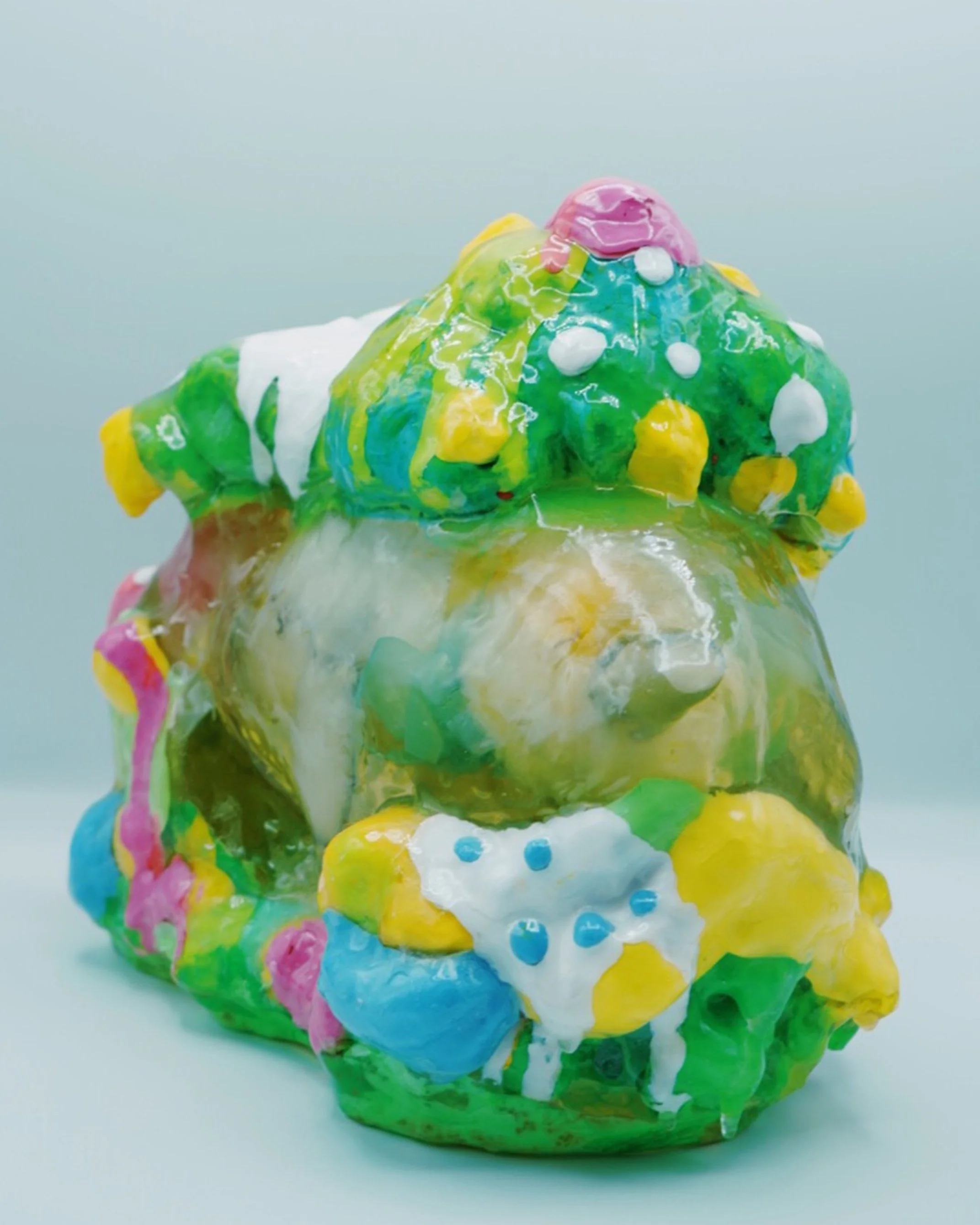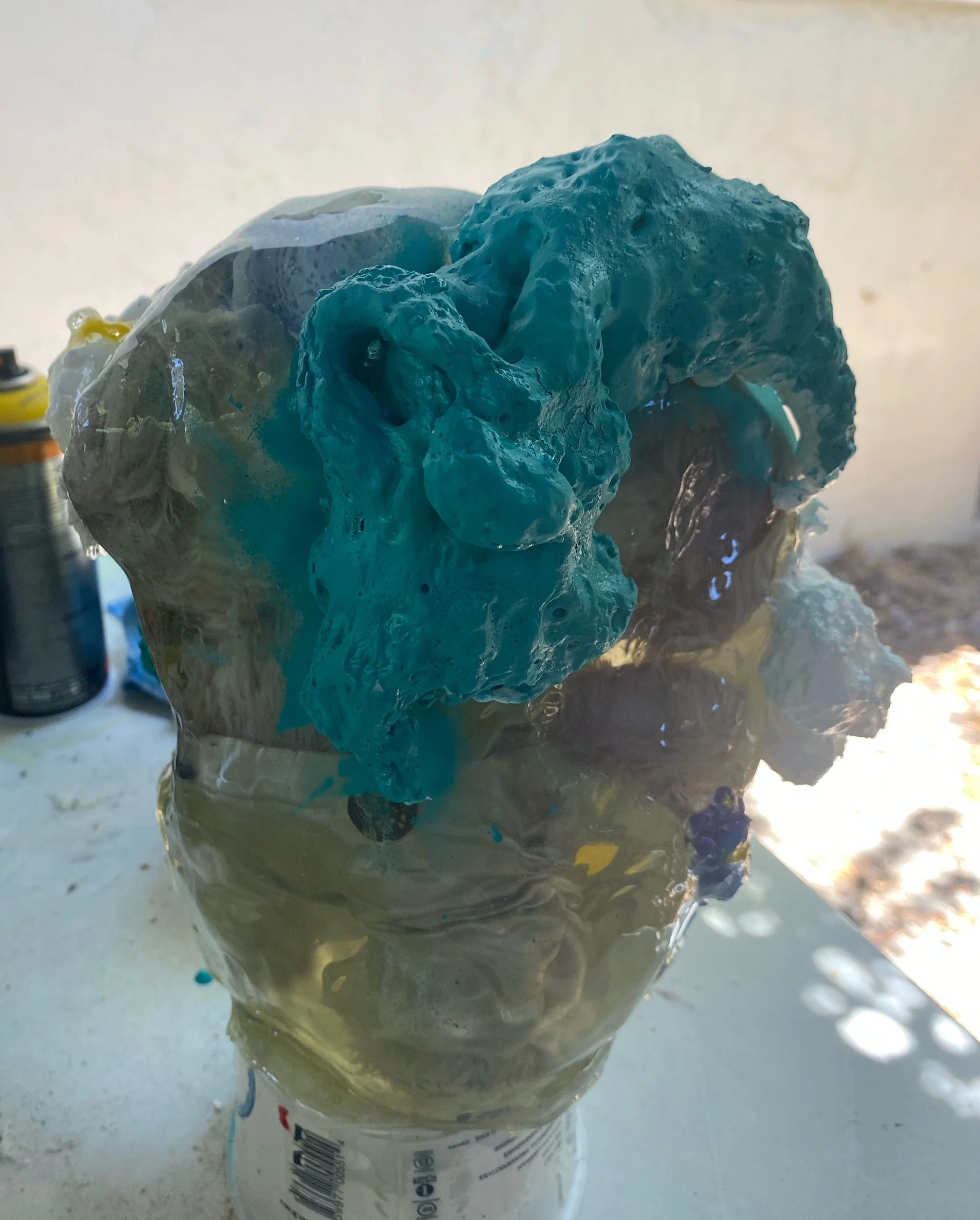 This collection reflects the memories that we hold so deeply inside of us. Each resin sculpture contains a plushie at its center. The sculptures are masked and textured with foam, clay, spray paint and acrylic, mimicking the dream-like state memories can reside in. At first glance, the plushie looks familiar, almost identical to the plushie I played with as a child. However, as you come closer, it is noticeable that the plushie is poorly stitched with fabric that does not match the original.