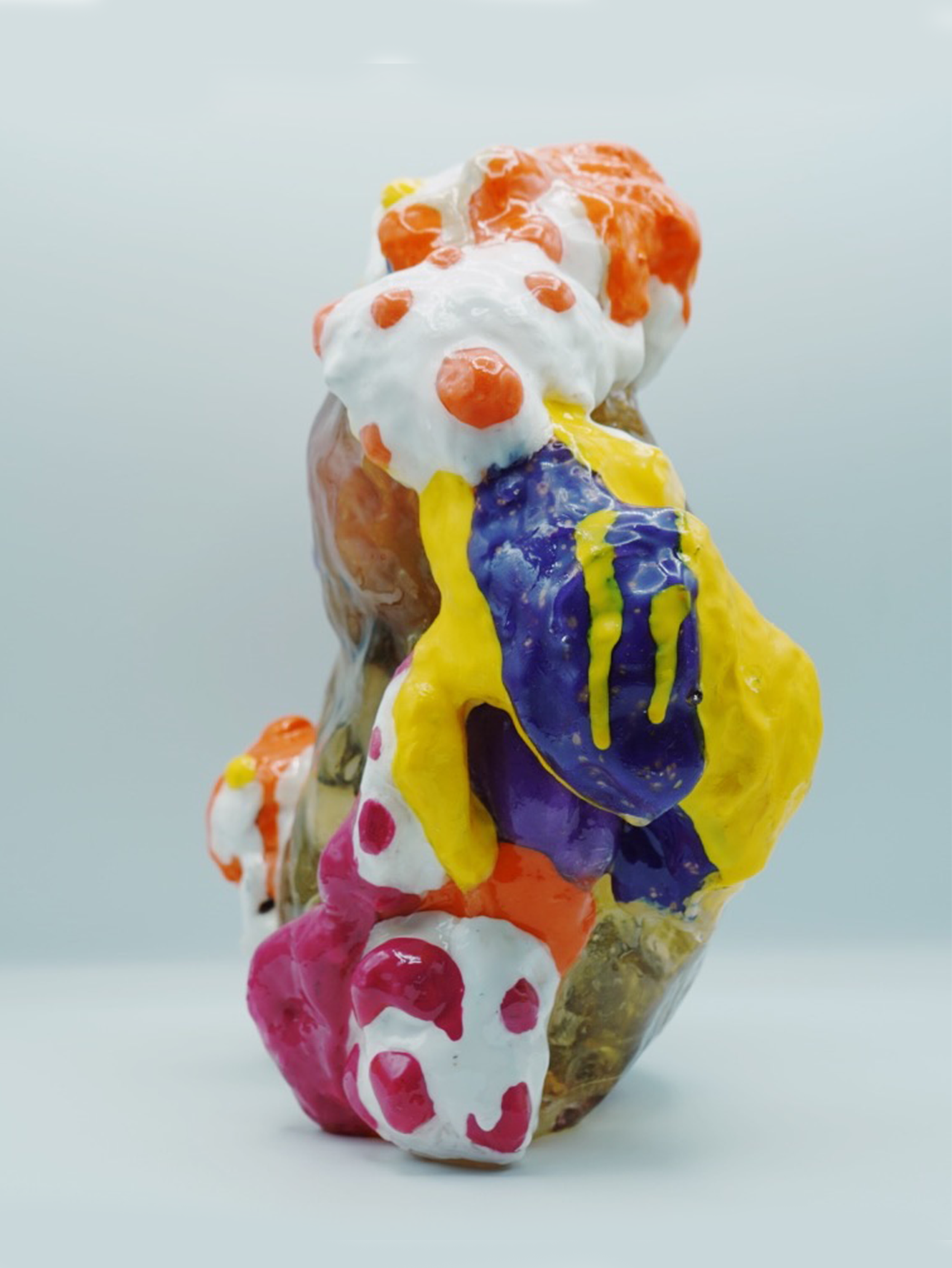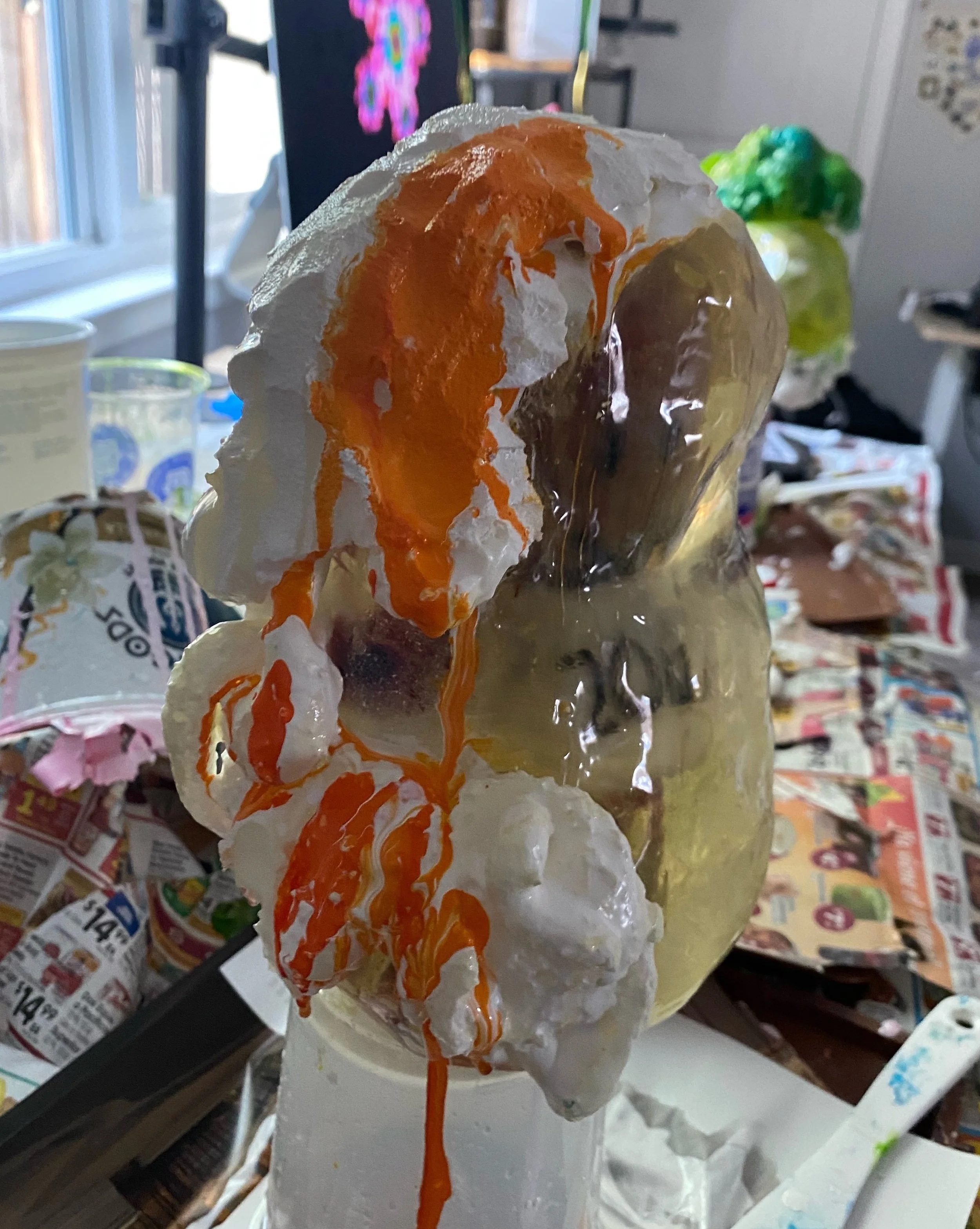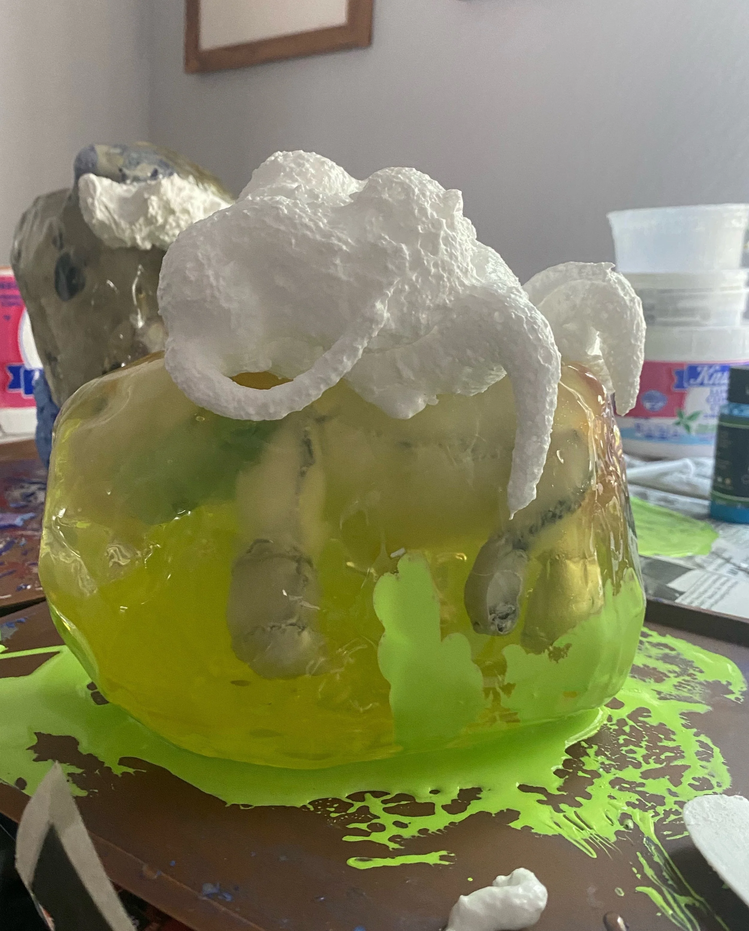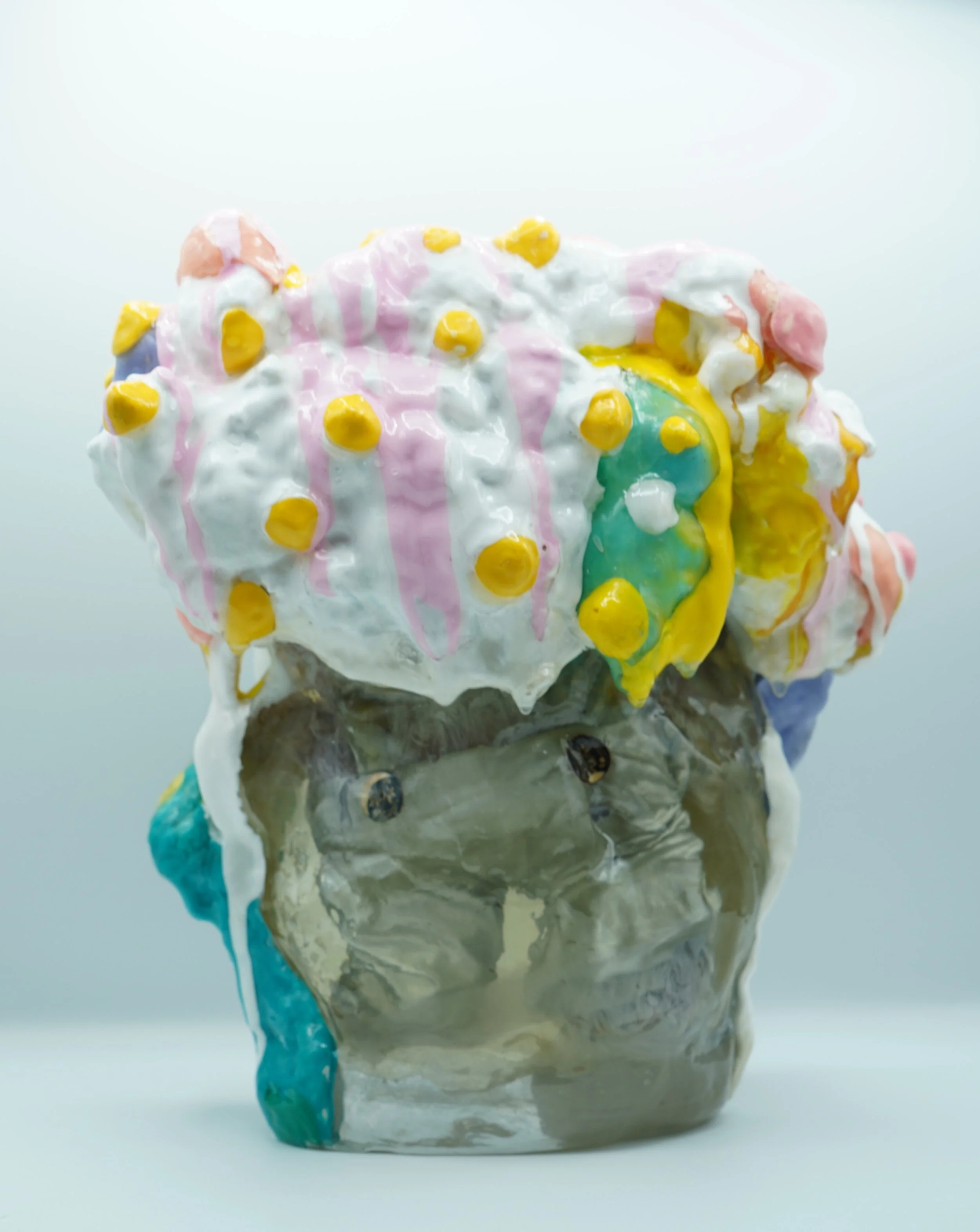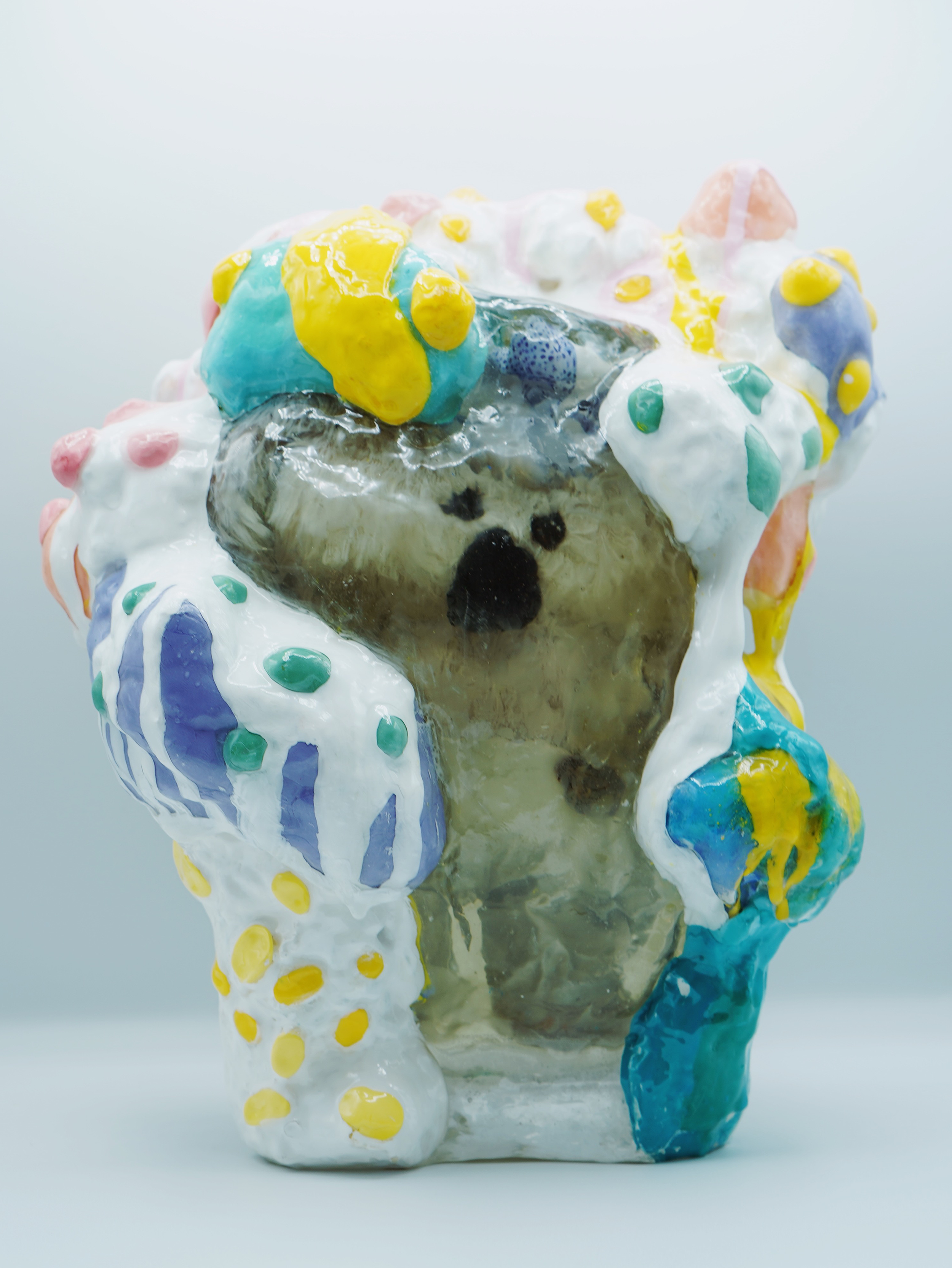 This collection reflects the memories that we hold so deeply inside of us. Each resin sculpture contains a plushie at its center. The sculptures are masked and textured with foam, clay, spray paint and acrylic, mimicking the dream-like state memories can reside in. At first glance, the plushie looks familiar, almost identical to the plushie I played with as a child. However, as you come closer, it is noticeable that the plushie is poorly stitched with fabric that does not match the original.