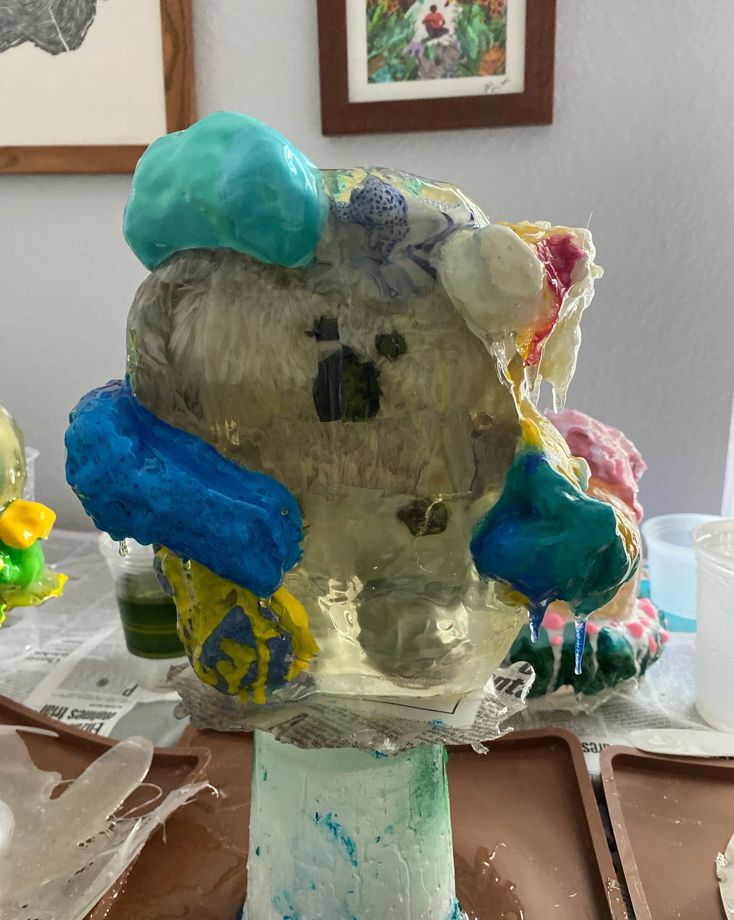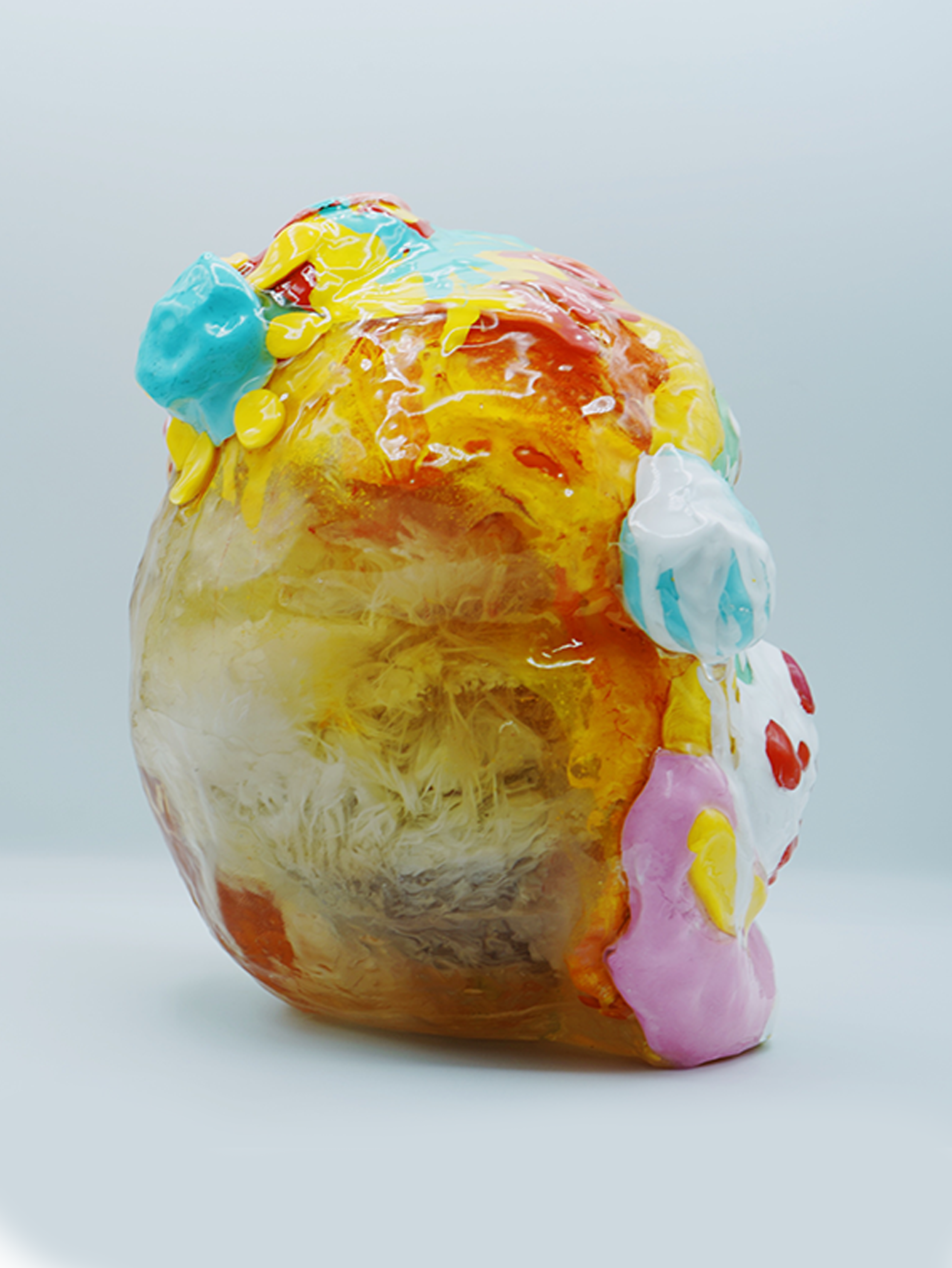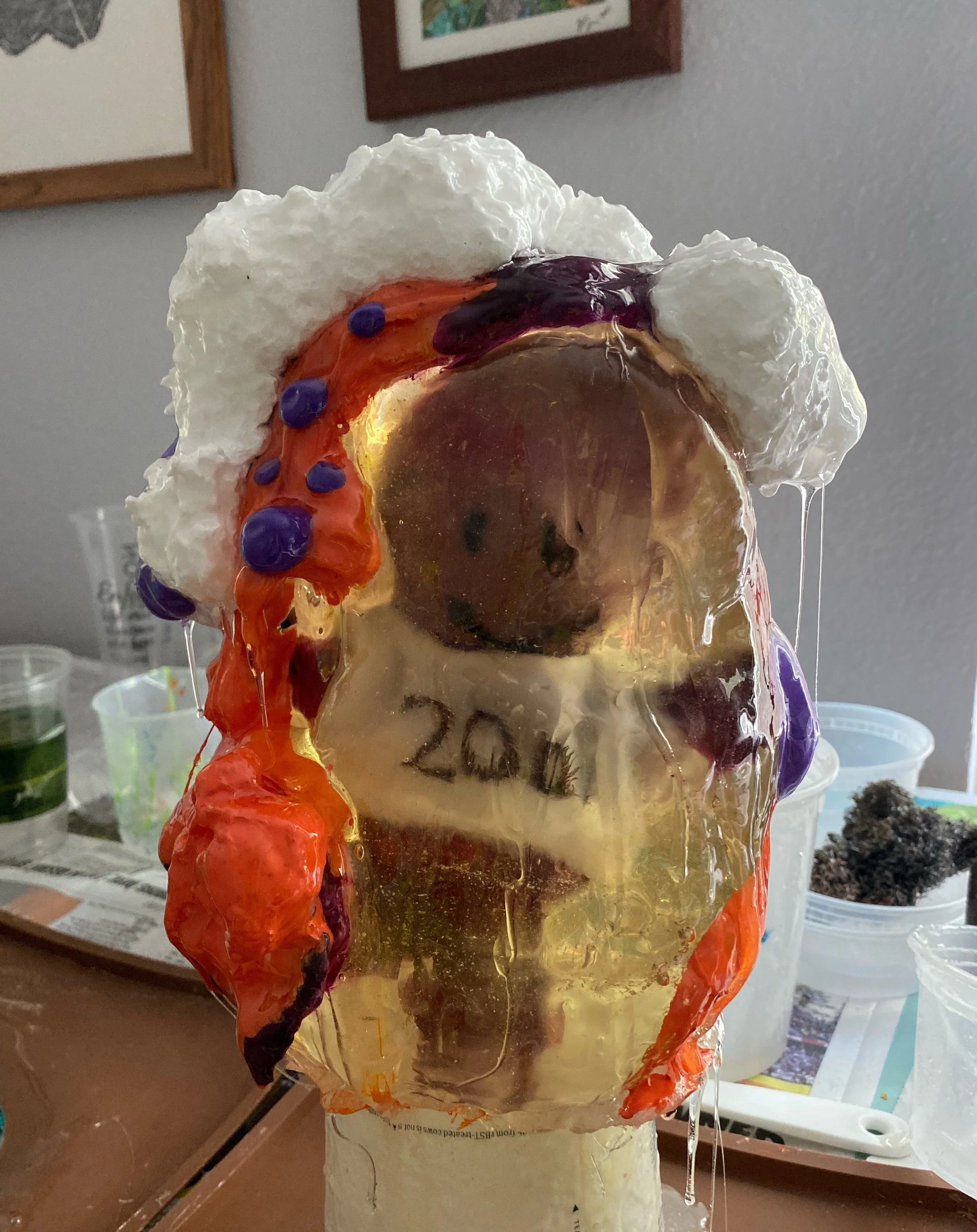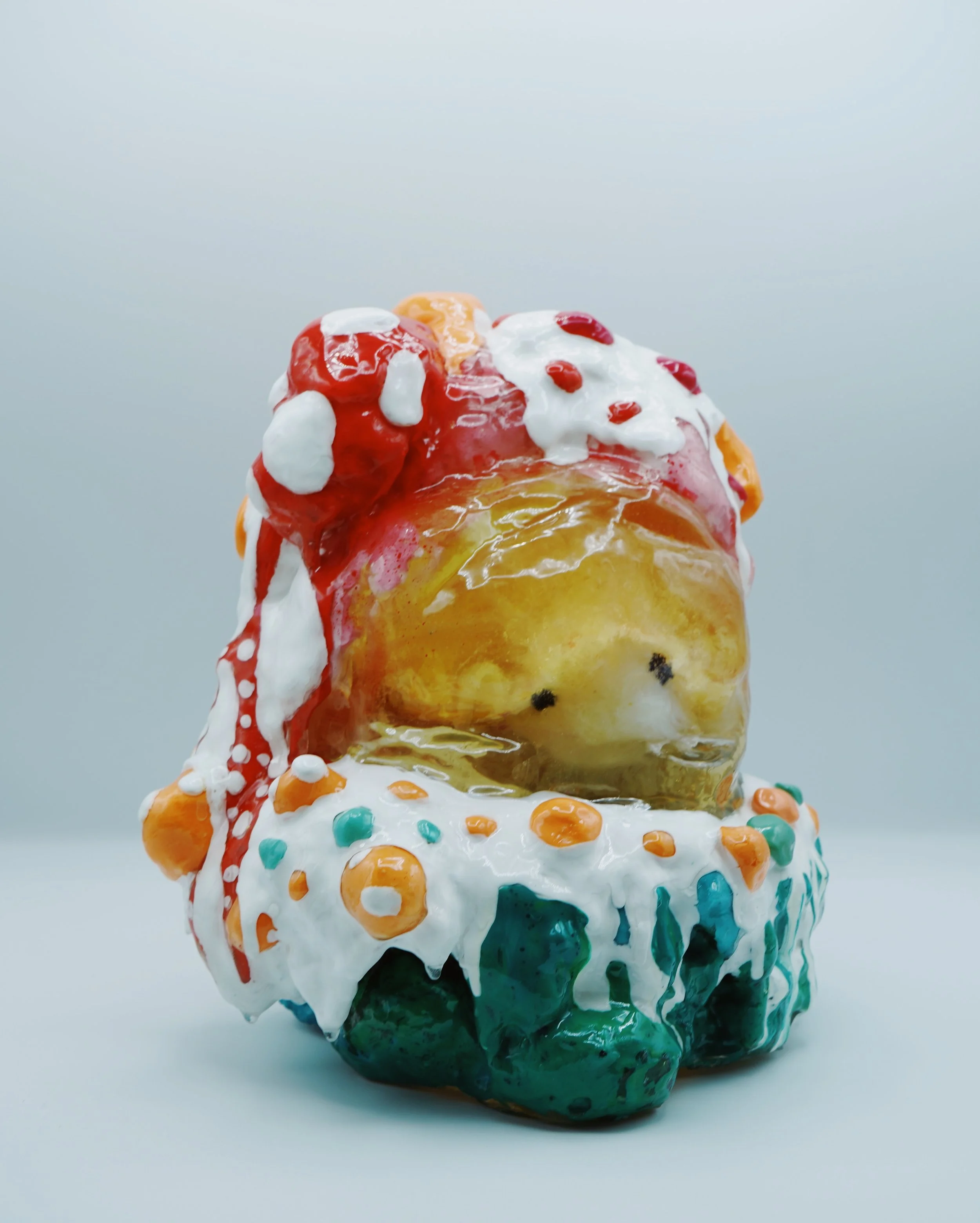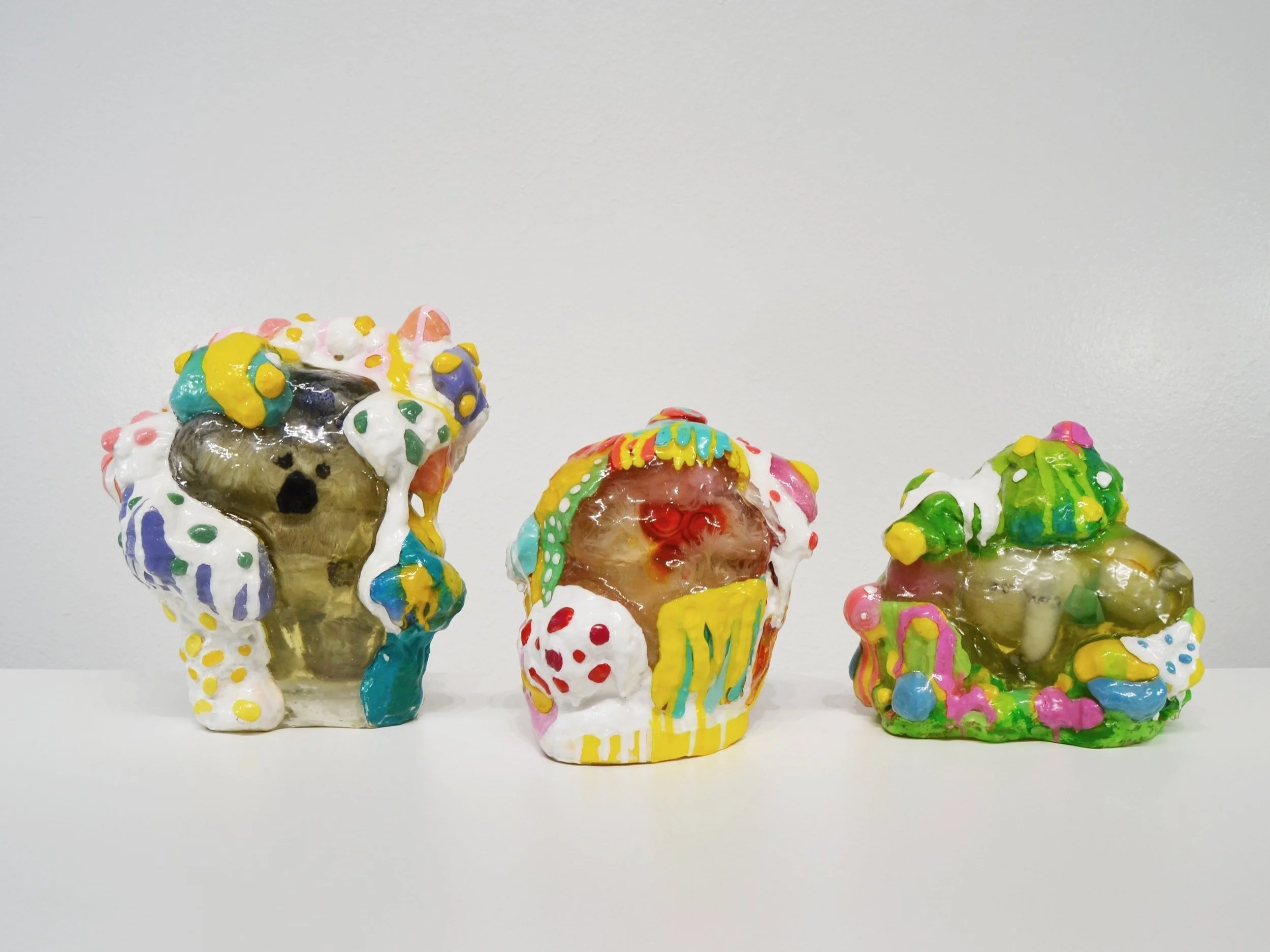 Each plushie is cast into resin and is floating at the center of the sculpture, representing how we hold on to certain memories, frozen in time and space.