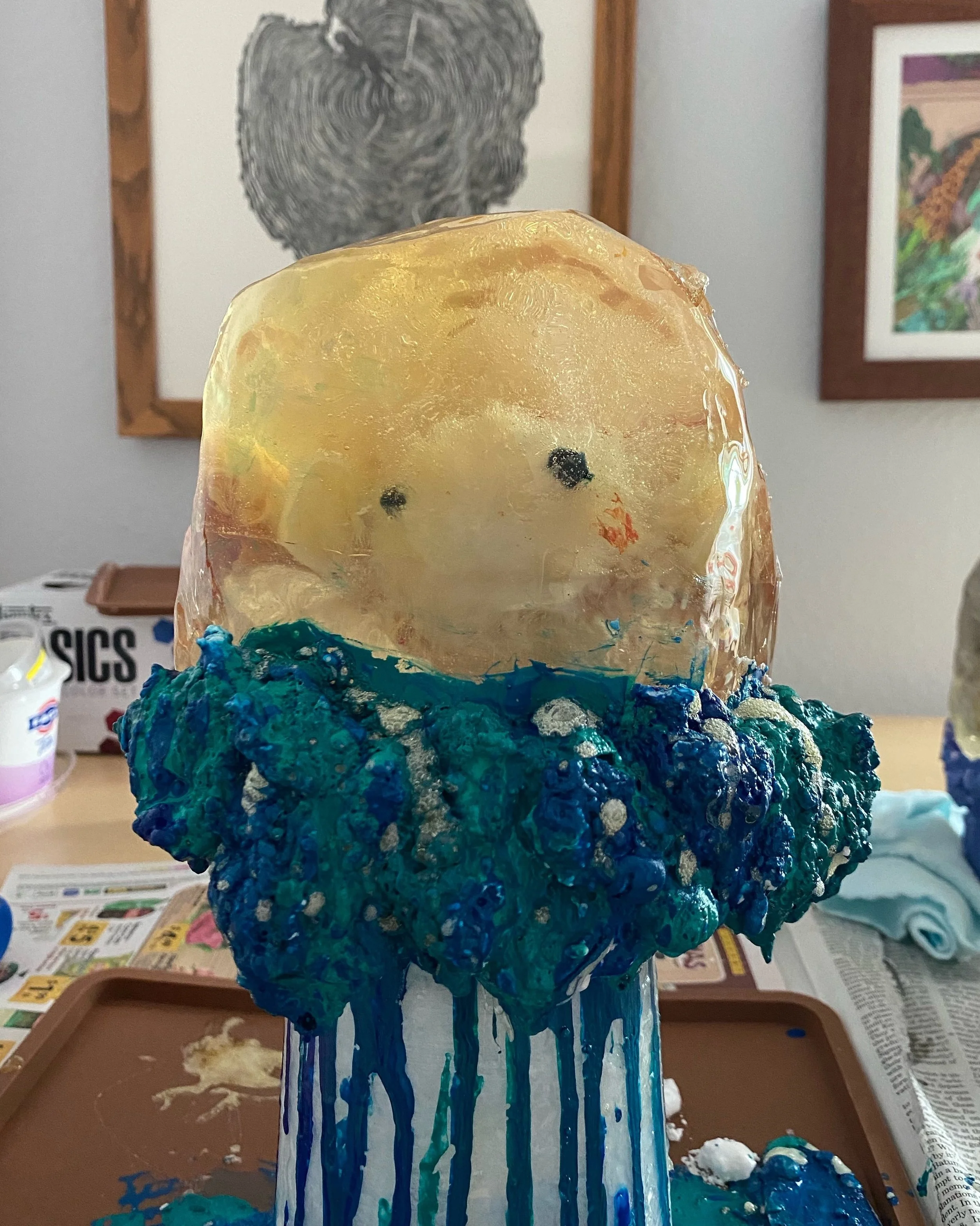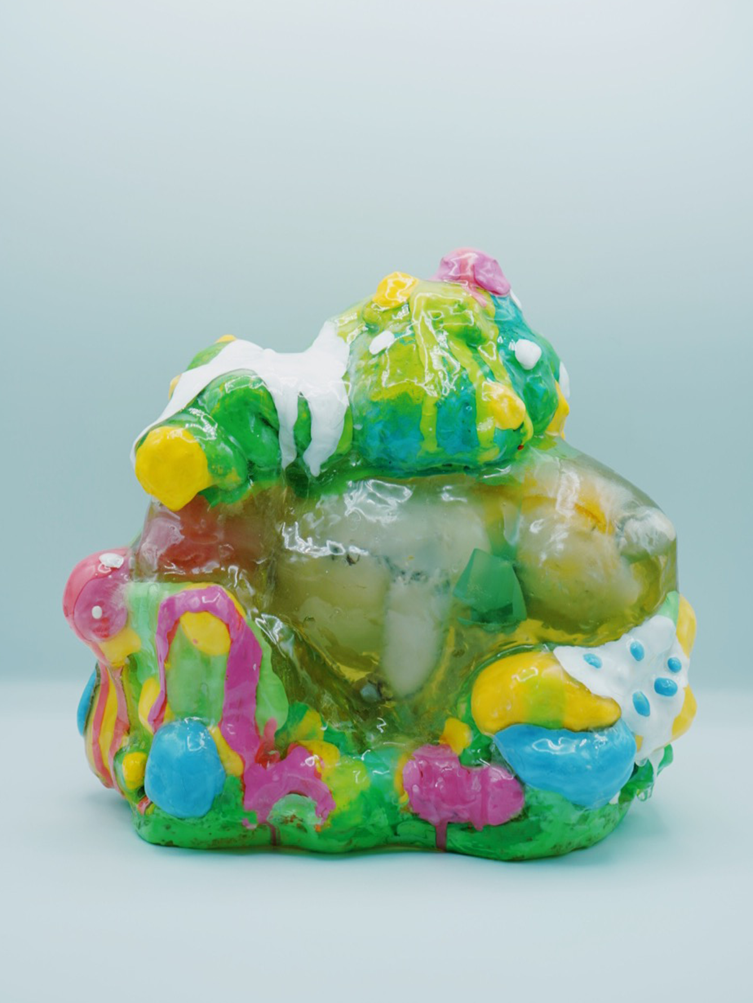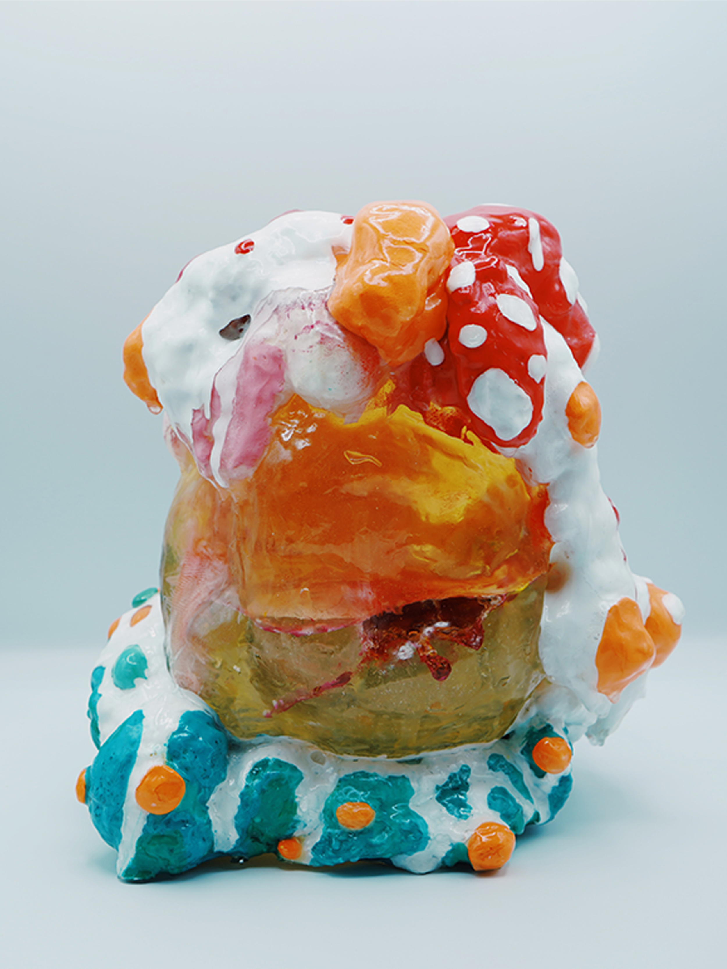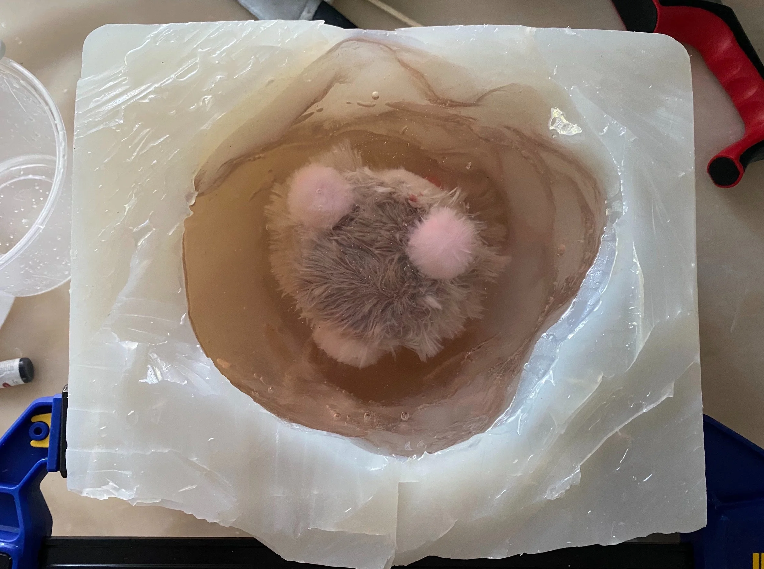 Each plushie is cast into resin and is floating at the center of the sculpture, representing how we hold on to certain memories, frozen in time and space.