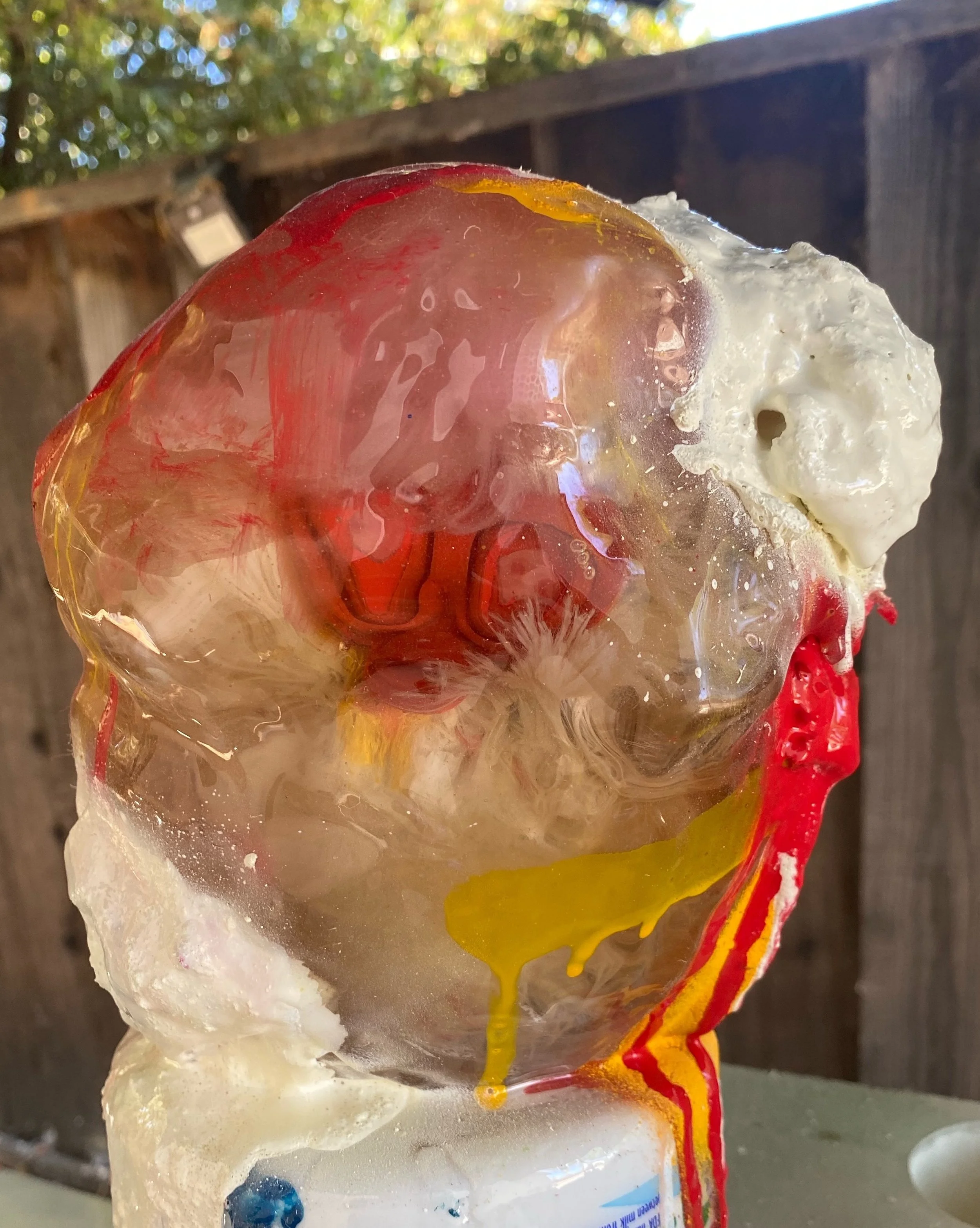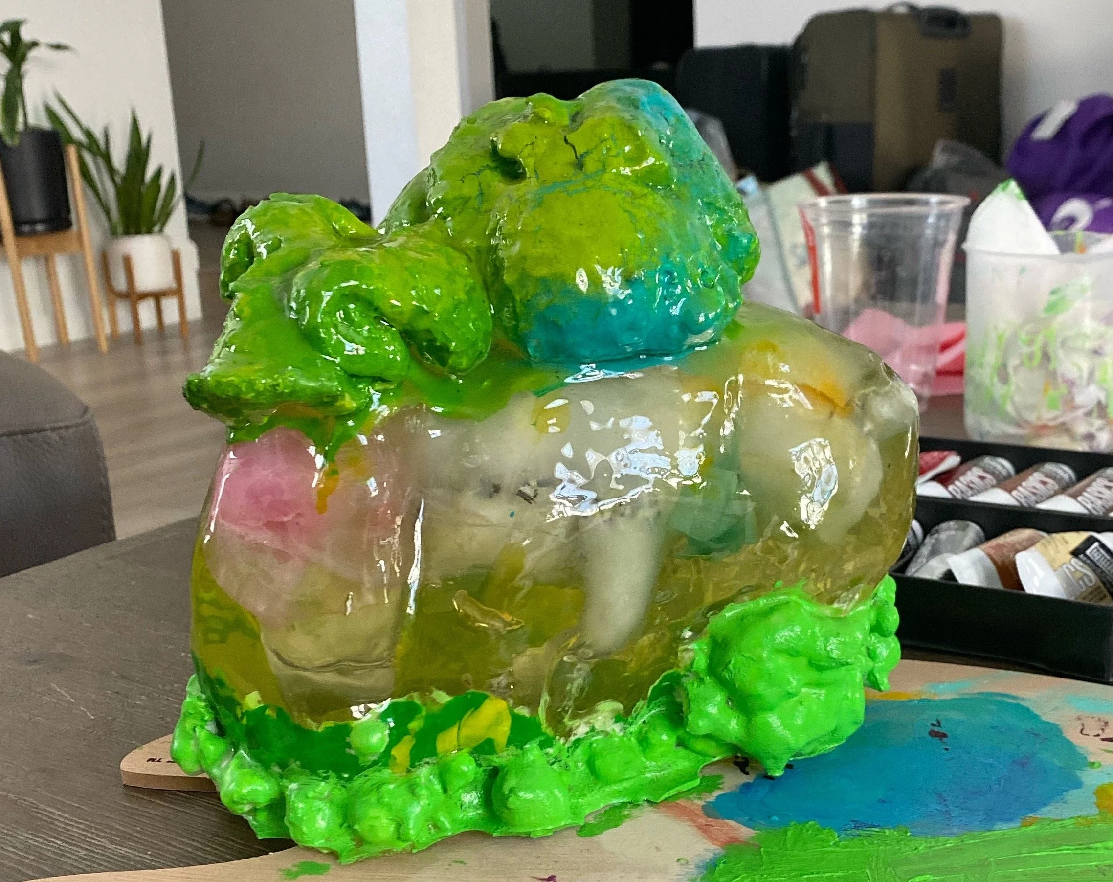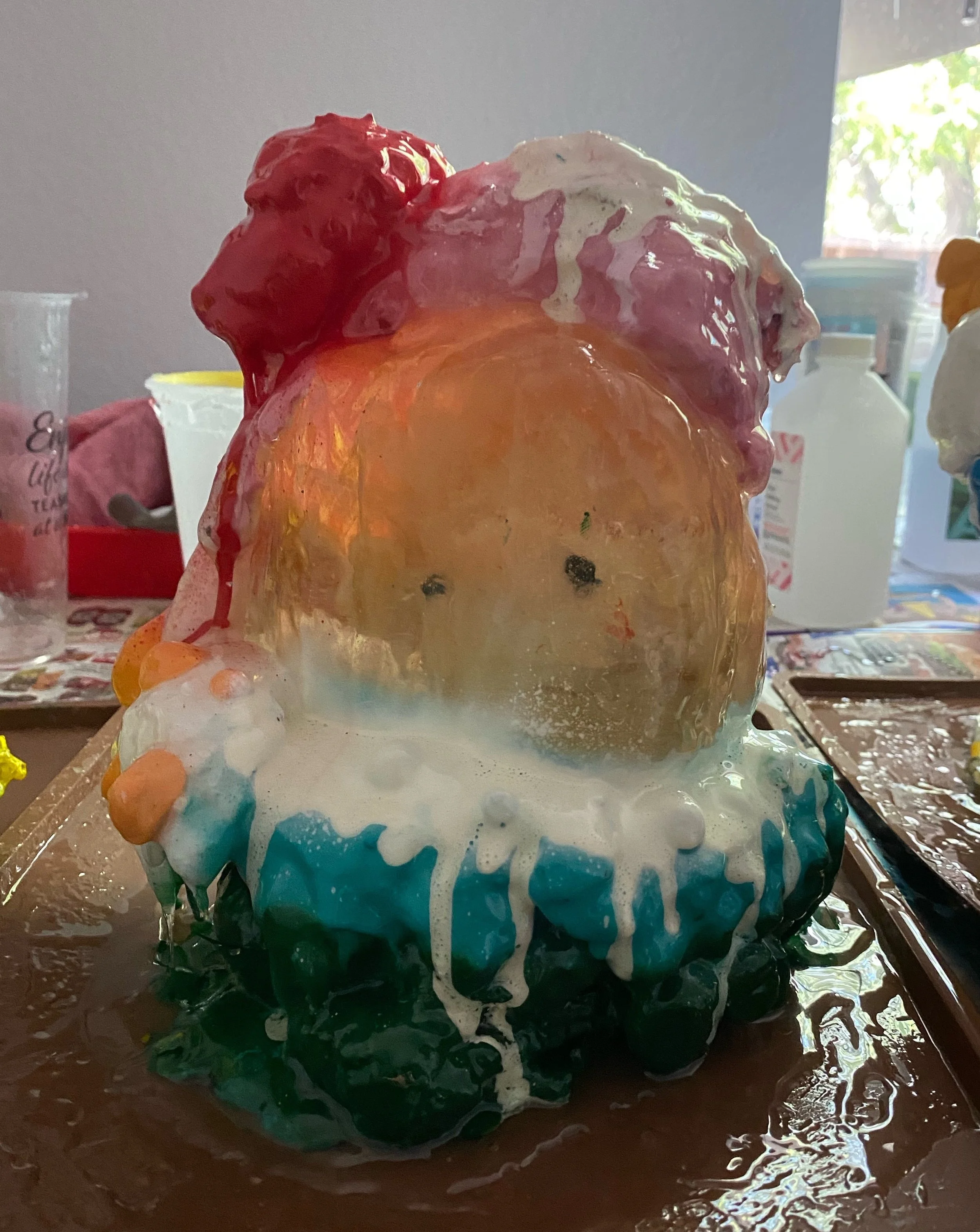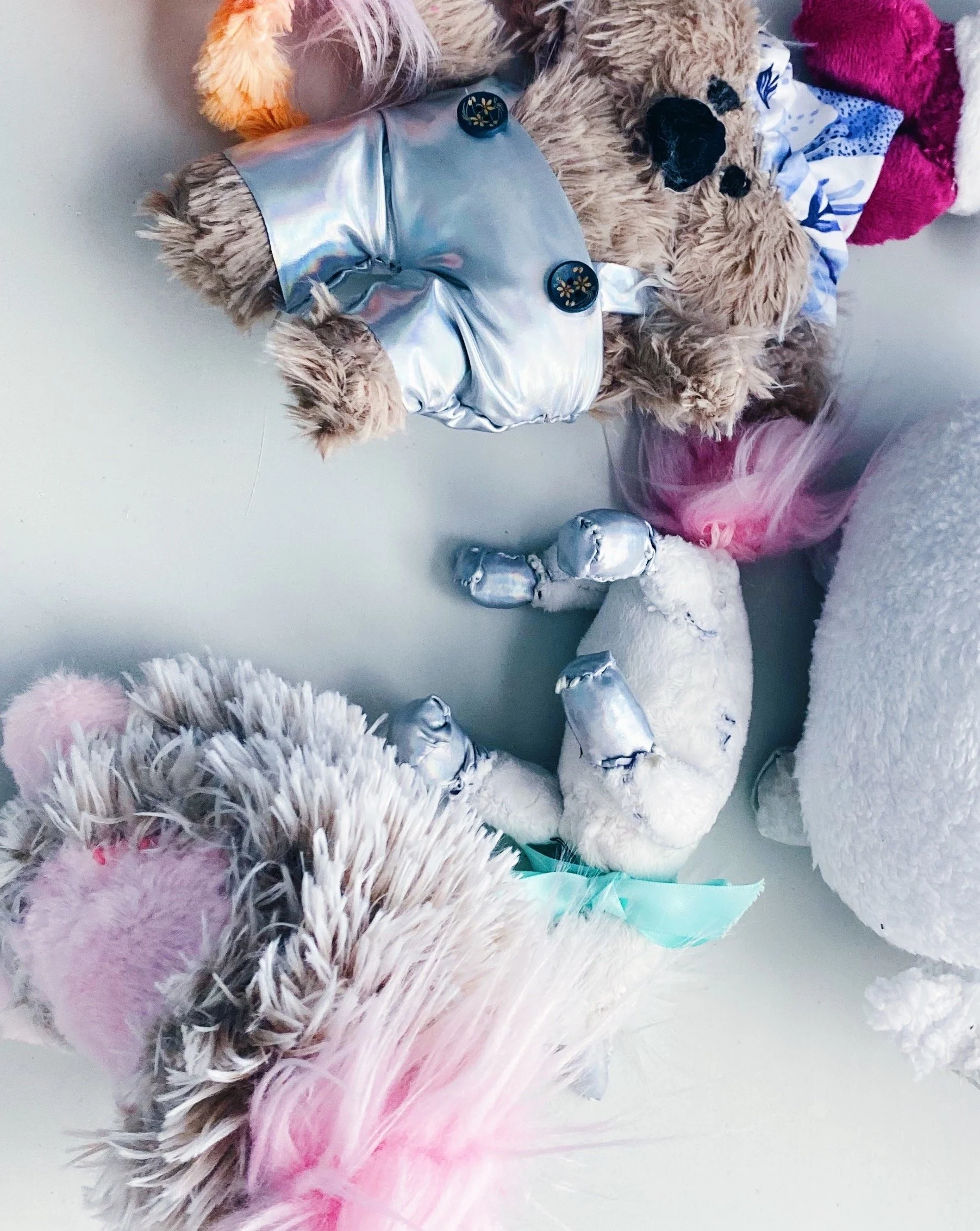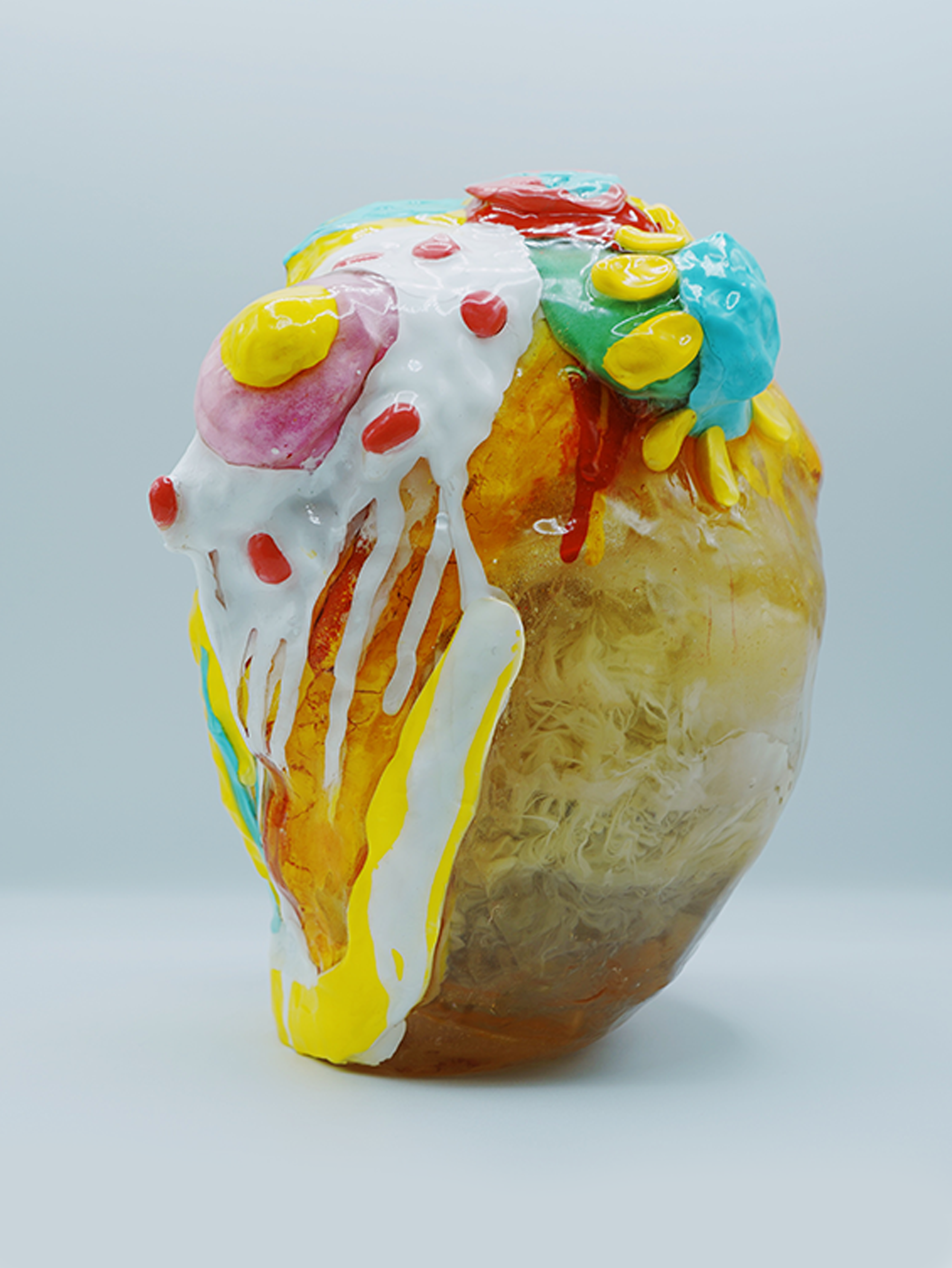 Each plushie is cast into resin and is floating at the center of the sculpture, representing how we hold on to certain memories, frozen in time and space.