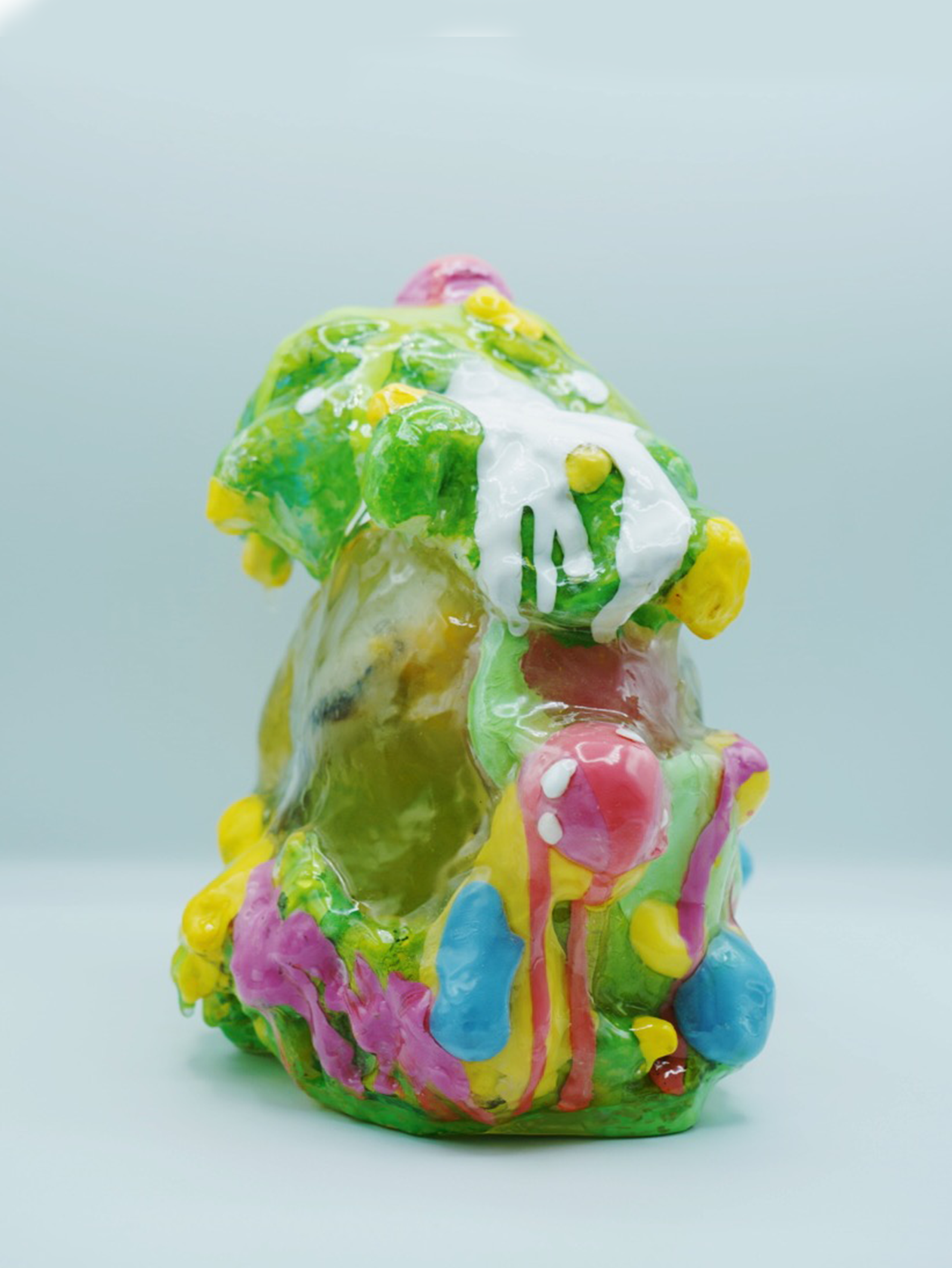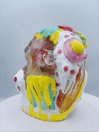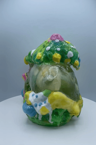 The "Cosmic Frog” marks the culmination of Happy’s House collection, delving into memory and perception. Emerging from primal slime, its metamorphic form embodies a profound journey, symbolizing the struggle between clarity and distortion. The half-covered, half-exposed resin frog represents the conflict within memories—some clear, some obscured. This duality mirrors the complex nature of recollection, concluding the exploration of memory and deception in Happy’s House.