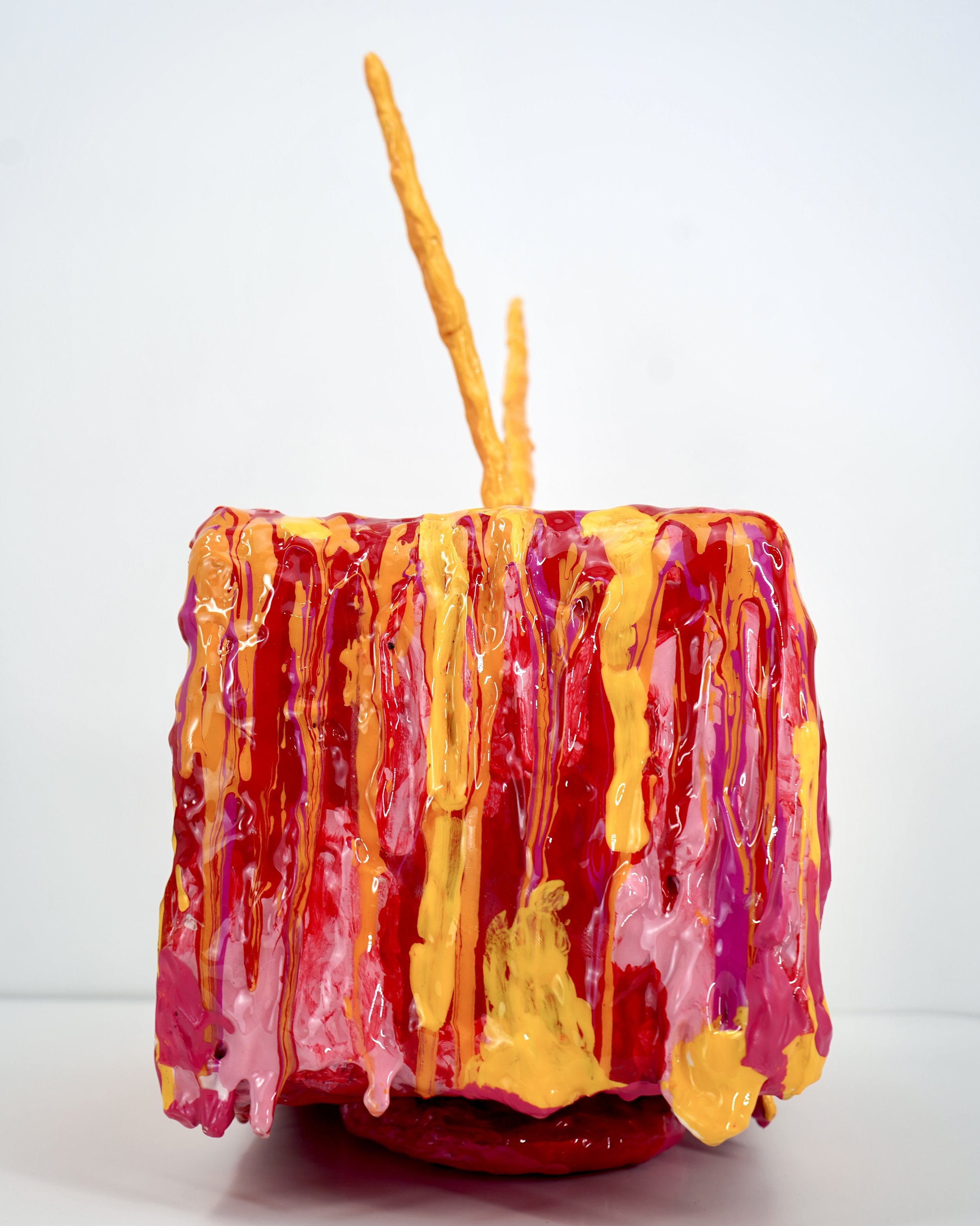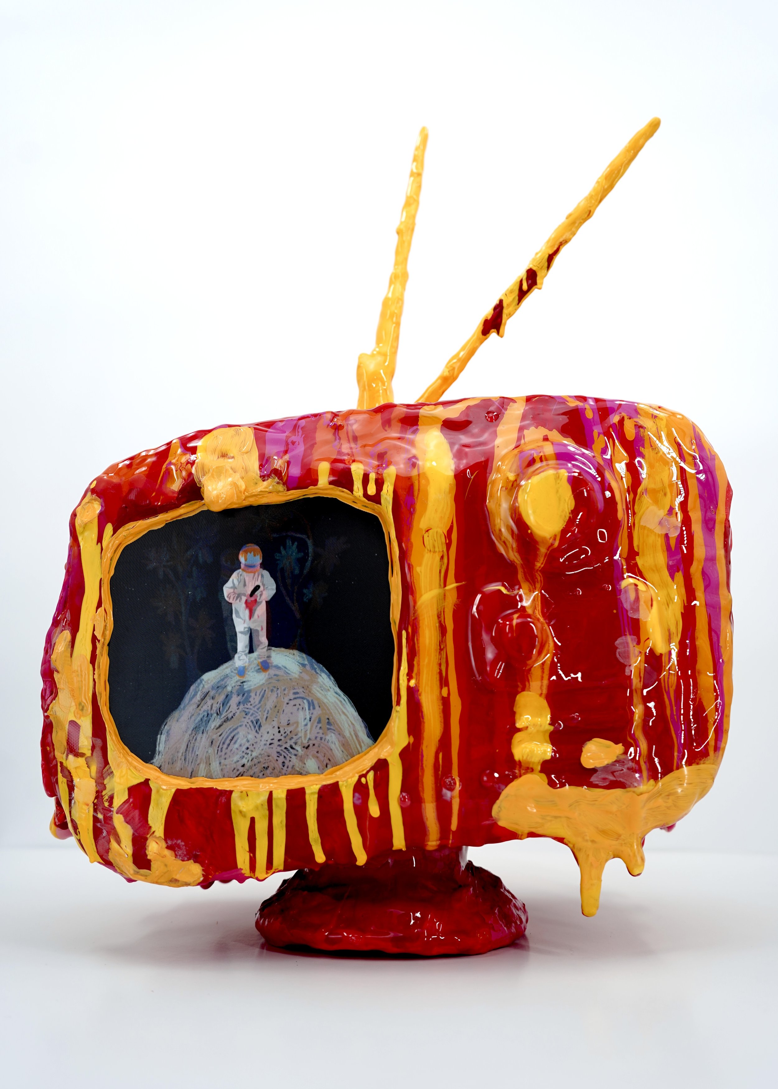 Infested Fantasies reflects the illusion of connection in situationships, where gestures hint at intimacy but nothing solid ever forms. Lenticular visuals mirror the distortion of showing up for someone who only ever appeared in fragments, shifting between moments of closeness, distance, and hesitation. The melting, candy-colored television frames these fleeting encounters like a performance, seducing the viewer while exposing the instability beneath. The work speaks to the extremes of modern dating, where desire, uncertainty, and longing collide, and where the promise of connection can dissolve as quickly as it appears.